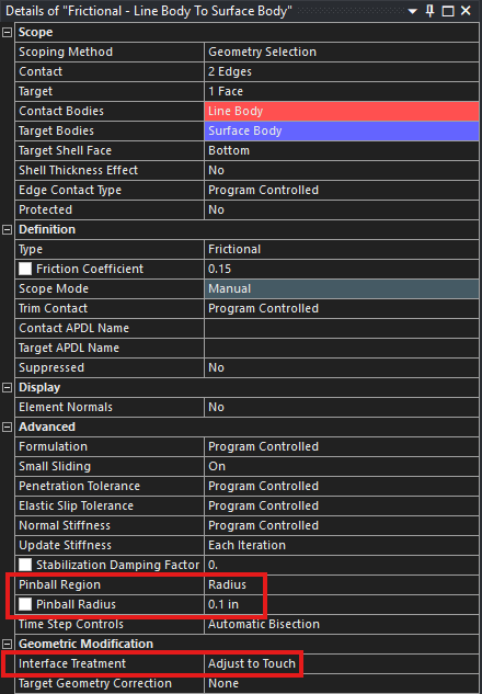 As the Rope is modeled as a Line Body and the Drum is modeled as a Surface Body, the Pinball Radius for this contact needs to be sufficiently large to capture the interaction between these different bodies. For this geometer the Pinball Radius was set to be 0.1 inches. The Interface Treatment was set to be Adjust to Touch to eliminate any gaps that may exist within the modeled geometery.
